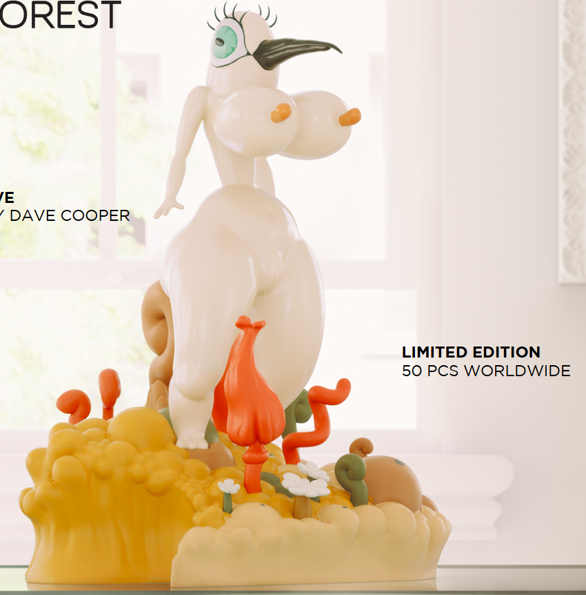 Dave Cooper’s works reflect on hedonism, body image, concepts of beauty and sexuality, with randy characters often set in gelatinous landscapes. The common denominator in all his works, as the artist explains, is “an element of extreme contrast, whether it’s cute and horrifying, innocent and lurid, grungy and delicate, light and dark.” Without departing from this line, the artist has designed the character of Eve.